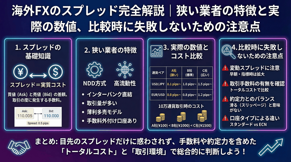 本記事では、海外FXのスプレッドの基礎知識から、スプレッドが狭い業者の特徴、実際のスプレッドの考え方、さらに比較する際に注意すべきポイントまでを体系的に解説します。